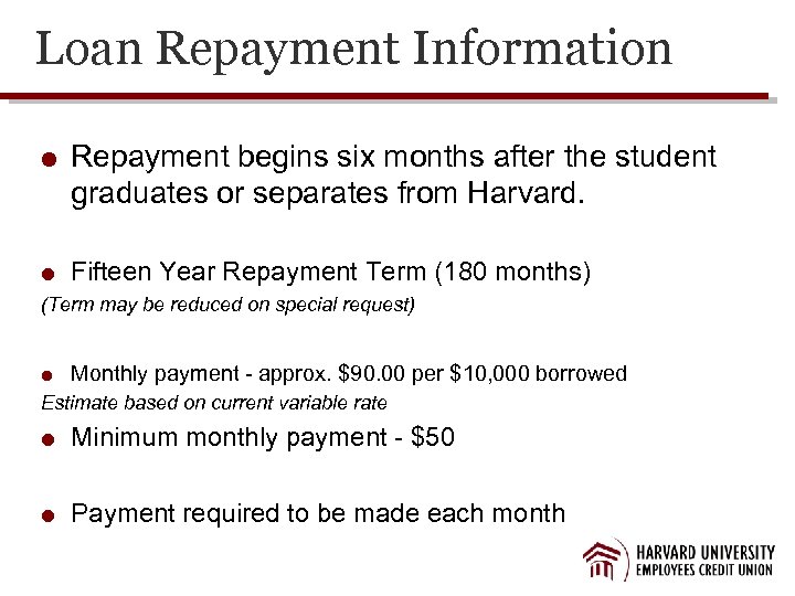 Loan Repayment Information Repayment begins six months after the student graduates or separates from Harvard. Fifteen Year Repayment Term (180 months) (Term may be reduced on special request) Monthly payment - approx. $90. 00 per $10, 000 borrowed Estimate based on current variable rate Minimum monthly payment - $50 Payment required to be made each month