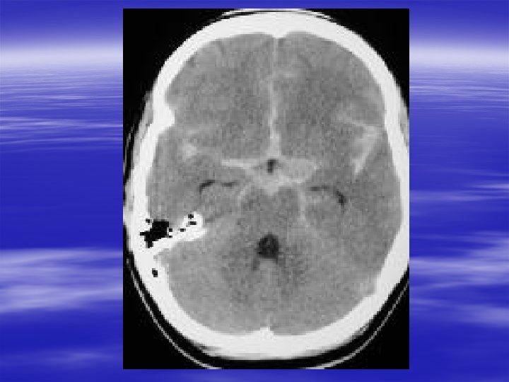 Specific Head Injuries § Skull Fractures – Basilar Fracture § Most common-petrous portion of temporal bone, the EAC and TM § Dural tear – CSF otorrhea – CSF rhinorrhea – Battle Sign – Raccoon Sign – Hemotympanum – Vertigo – Hearing loss – Seventh nerve palsy § CSF testing – Ring sign, glucose or CSF transferrin § Should be started on prophylactic antibiotics – Ceftriaxone 1 -2 gm