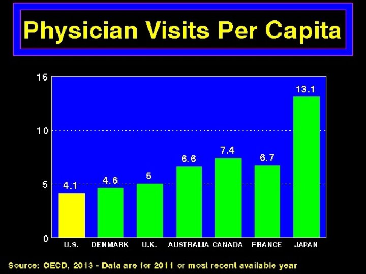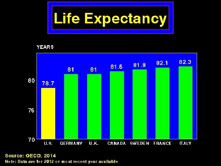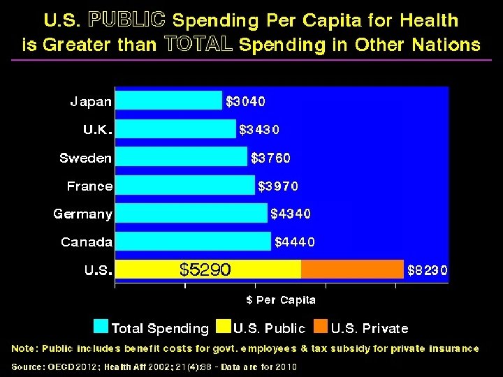 Health Care Expenditures per Capita n U. S. = $9, 255 (17. 4% of GDP) n U. S. #1 in spending on health care, #25 in spending on social services n Canada, Australia, Japan, Europe: $3, 000 to $6, 000 n Average for low income developing nations = $22 -$25