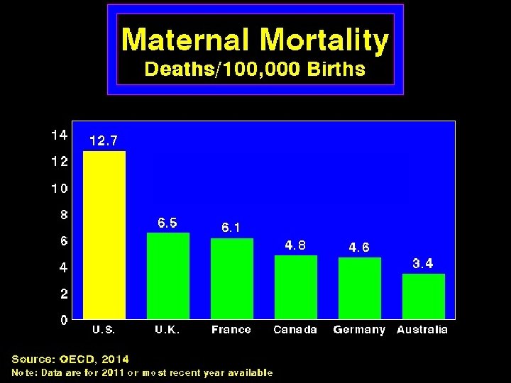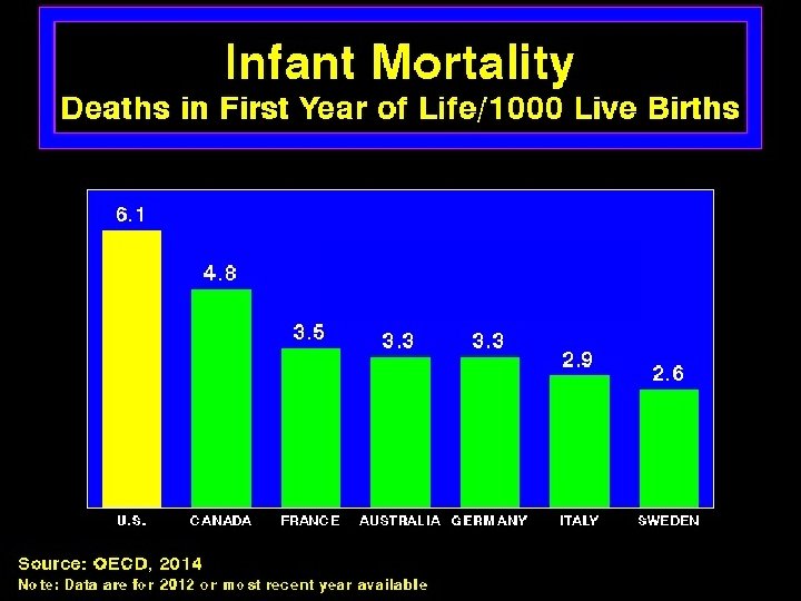 The State of U. S. Health Care n US ranks near the bottom among westernized nations in overall population health, life expectancy, infant and maternal mortality, etc. n 15% of Americans live in poverty n 22% of US children live in poverty