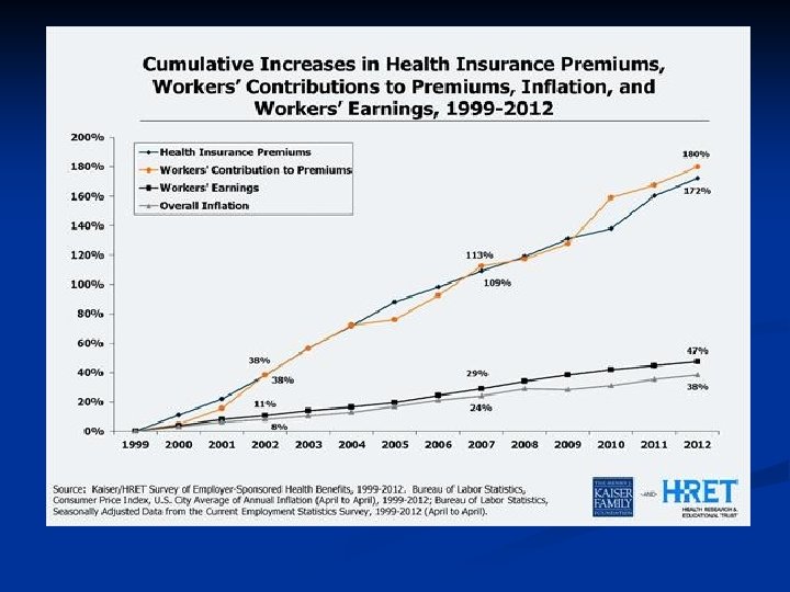 Who Pays for Health Care? n Government (federal, state, and local) n Medicare, Medicaid, VA, IHS, jails and prisons n Private insurance: n 806 companies, each with an assortment of plans) n Just 2 companies control over 50% of the market in 45 states n Primarily employer-based n Out-of-pocket