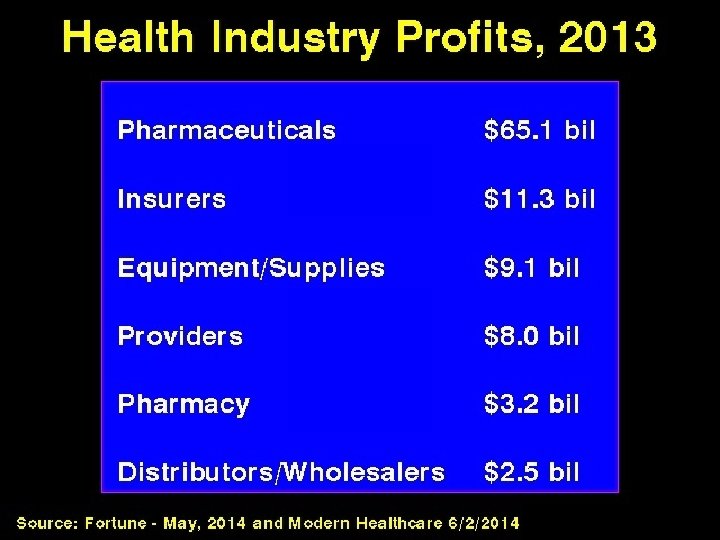 Pharmaceutical Industry n n n Often quoted cost of developing new drugs (Tufts study) based on myriad biased/unreal assumptions =$1. 3 billion n Actual median cost to drug company = $60 million (DW Light, Biosciences 2011; 6: 1 -17. Cancer drugs increasingly expensive n 11/12 FDA approved anti-cancer agents cost over $100, 000/yr (2014) Universal drug coverage would be cost-saving
