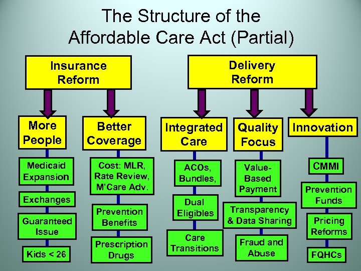 The Structure of the Affordable Care Act (Partial) Delivery Reform Insurance Reform More People Medicaid Expansion Better Coverage Cost: MLR, Rate Review, M’Care Adv. Exchanges Guaranteed Issue Kids < 26 Prevention Benefits Prescription Drugs Integrated Care ACOs, Bundles, Dual Eligibles Care Transitions Quality Focus Value. Based Payment Transparency & Data Sharing Fraud and Abuse Innovation CMMI Prevention Funds Pricing Reforms 10 FQHCs