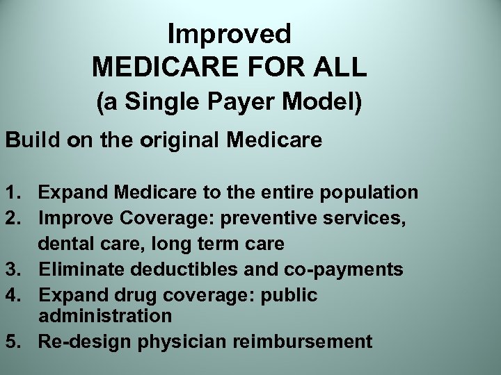 Improved MEDICARE FOR ALL (a Single Payer Model) Build on the original Medicare 1. Expand Medicare to the entire population 2. Improve Coverage: preventive services, dental care, long term care 3. Eliminate deductibles and co-payments 4. Expand drug coverage: public administration 5. Re-design physician reimbursement