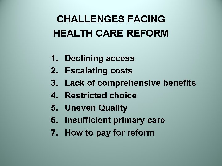 CHALLENGES FACING HEALTH CARE REFORM 1. 2. 3. 4. 5. 6. 7. Declining access Escalating costs Lack of comprehensive benefits Restricted choice Uneven Quality Insufficient primary care How to pay for reform