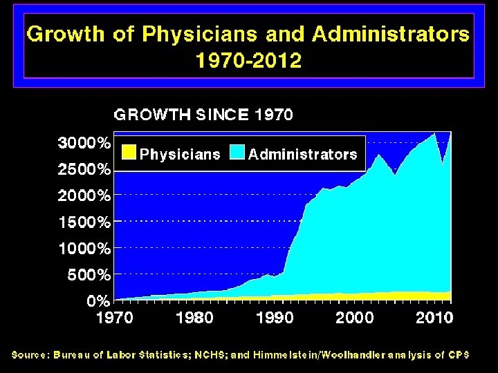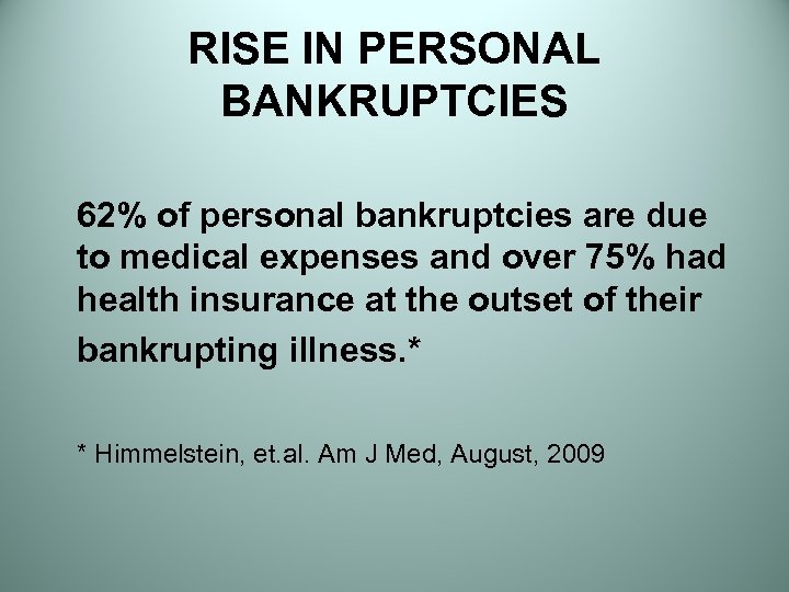 RISE IN PERSONAL BANKRUPTCIES 62% of personal bankruptcies are due to medical expenses and over 75% had health insurance at the outset of their bankrupting illness. * * Himmelstein, et. al. Am J Med, August, 2009