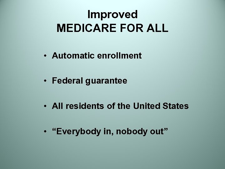 Improved MEDICARE FOR ALL • Automatic enrollment • Federal guarantee • All residents of the United States • “Everybody in, nobody out”