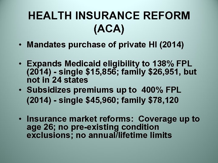 HEALTH INSURANCE REFORM (ACA) • Mandates purchase of private HI (2014) • Expands Medicaid eligibility to 138% FPL (2014) - single $15, 856; family $26, 951, but not in 24 states • Subsidizes premiums up to 400% FPL (2014) - single $45, 960; family $78, 120 • Insurance market reforms: Coverage up to age 26; no pre-existing condition exclusions; no annual/lifetime limits