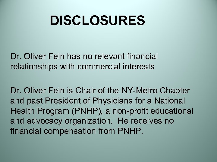 DISCLOSURES Dr. Oliver Fein has no relevant financial relationships with commercial interests Dr. Oliver Fein is Chair of the NY-Metro Chapter and past President of Physicians for a National Health Program (PNHP), a non-profit educational and advocacy organization. He receives no financial compensation from PNHP.