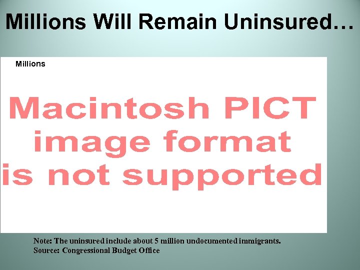 Millions Will Remain Uninsured… Millions Note: The uninsured include about 5 million undocumented immigrants. Source: Congressional Budget Office