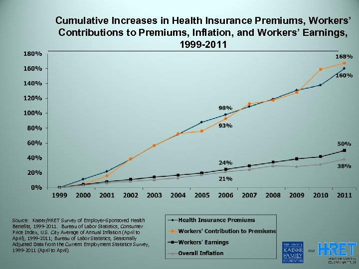 Cumulative Increases in Health Insurance Premiums, Workers’ Contributions to Premiums, Inflation, and Workers’ Earnings, 1999 -2011 Source: Kaiser/HRET Survey of Employer-Sponsored Health Benefits, 1999 -2011. Bureau of Labor Statistics, Consumer Price Index, U. S. City Average of Annual Inflation (April to April), 1999 -2011; Bureau of Labor Statistics, Seasonally Adjusted Data from the Current Employment Statistics Survey, 1999 -2011 (April to April).