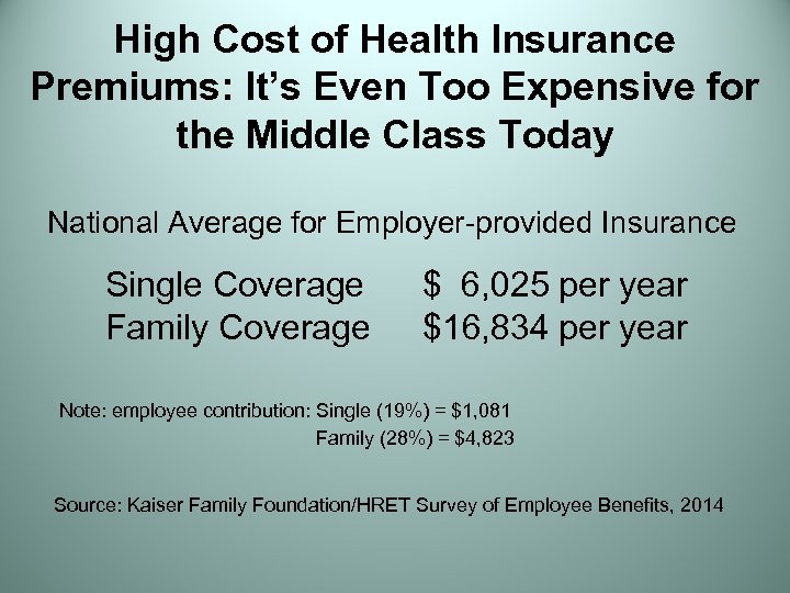 High Cost of Health Insurance Premiums: It’s Even Too Expensive for the Middle Class Today National Average for Employer-provided Insurance Single Coverage $ 6, 025 per year Family Coverage $16, 834 per year Note: employee contribution: Single (19%) = $1, 081 Family (28%) = $4, 823 Source: Kaiser Family Foundation/HRET Survey of Employee Benefits, 2014