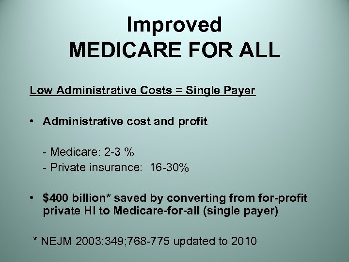 Improved MEDICARE FOR ALL Low Administrative Costs = Single Payer • Administrative cost and profit - Medicare: 2 -3 % - Private insurance: 16 -30% • $400 billion* saved by converting from for-profit private HI to Medicare-for-all (single payer) * NEJM 2003: 349; 768 -775 updated to 2010
