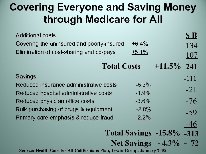 Covering Everyone and Saving Money through Medicare for All Additional costs Covering the uninsured and poorly-insured +6. 4% Elimination of cost-sharing and co-pays +5. 1% Total Costs $B 134 107 +11. 5% 241 Savings Reduced insurance administrative costs -5. 3% Reduced hospital administrative costs -1. 9% Reduced physician office costs -3. 6% Bulk purchasing of drugs & equipment -2. 8% Primary care emphasis & reduce fraud -2. 2% -111 -21 -76 -59 -46 Total Savings -15. 8% -313 Net Savings - 4. 3% - 72 Source: Health Care for All Californians Plan, Lewin Group, January 2005