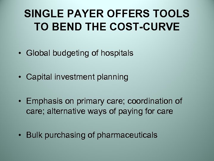 SINGLE PAYER OFFERS TOOLS TO BEND THE COST-CURVE • Global budgeting of hospitals • Capital investment planning • Emphasis on primary care; coordination of care; alternative ways of paying for care • Bulk purchasing of pharmaceuticals