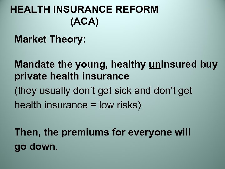 HEALTH INSURANCE REFORM (ACA) Market Theory: Mandate the young, healthy uninsured buy private health insurance (they usually don’t get sick and don’t get health insurance = low risks) Then, the premiums for everyone will go down.
