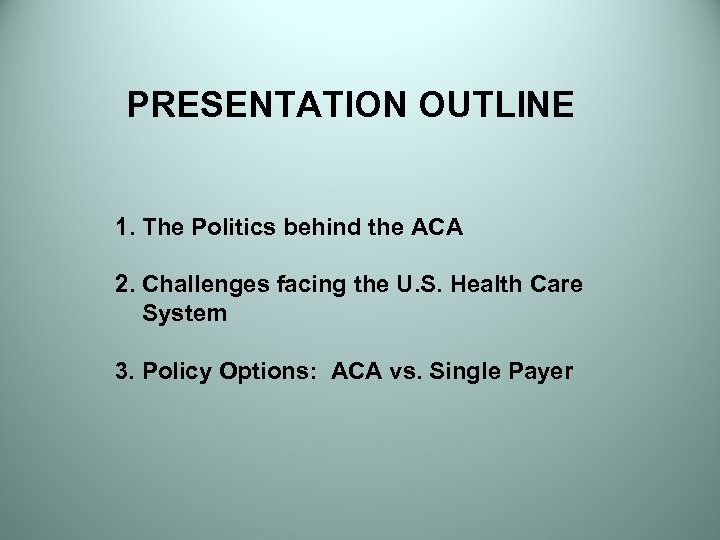 PRESENTATION OUTLINE 1. The Politics behind the ACA 2. Challenges facing the U. S. Health Care System 3. Policy Options: ACA vs. Single Payer