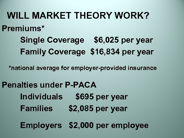 WILL MARKET THEORY WORK? Premiums* Single Coverage $6, 025 per year Family Coverage $16, 834 per year *national average for employer-provided insurance Penalties under P-PACA Individuals $695 per year Families $2, 085 per year Employers $2, 000 per employee