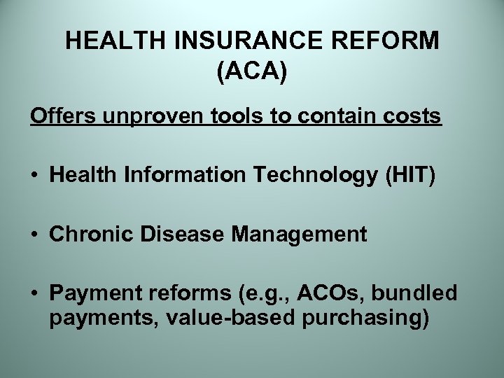 HEALTH INSURANCE REFORM (ACA) Offers unproven tools to contain costs • Health Information Technology (HIT) • Chronic Disease Management • Payment reforms (e. g. , ACOs, bundled payments, value-based purchasing)
