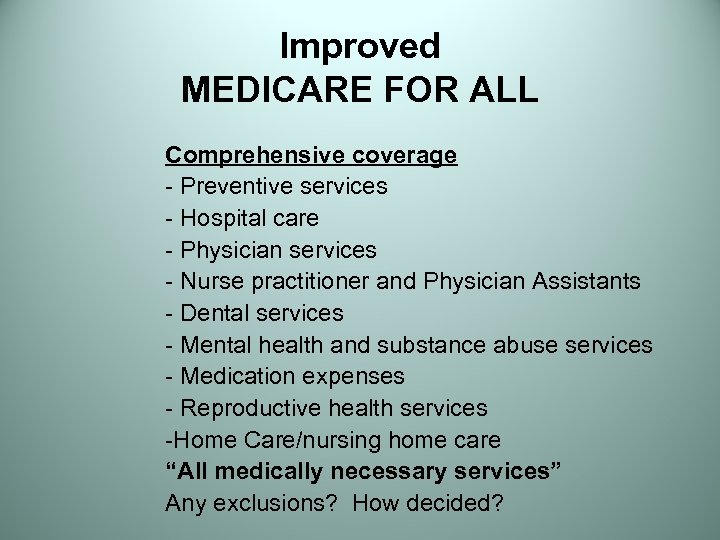 Improved MEDICARE FOR ALL Comprehensive coverage - Preventive services - Hospital care - Physician services - Nurse practitioner and Physician Assistants - Dental services - Mental health and substance abuse services - Medication expenses - Reproductive health services -Home Care/nursing home care “All medically necessary services” Any exclusions? How decided?