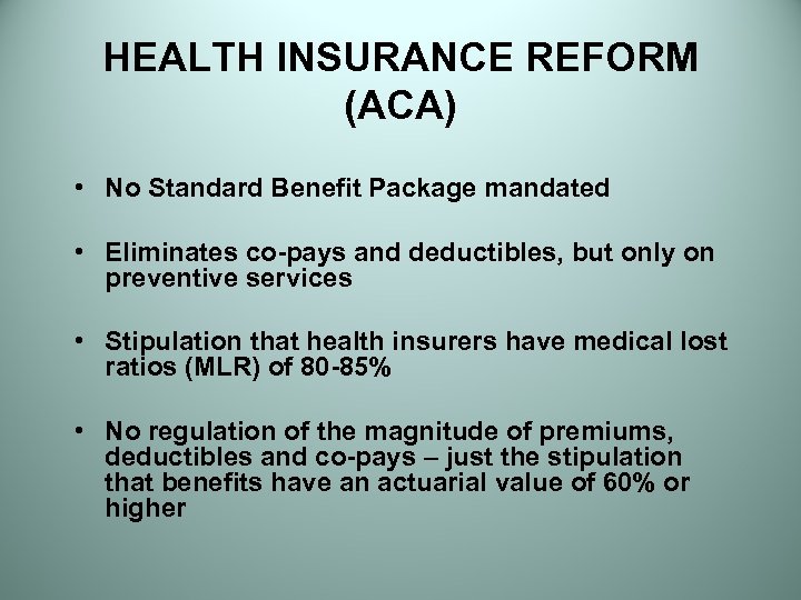 HEALTH INSURANCE REFORM (ACA) • No Standard Benefit Package mandated • Eliminates co-pays and deductibles, but only on preventive services • Stipulation that health insurers have medical lost ratios (MLR) of 80 -85% • No regulation of the magnitude of premiums, deductibles and co-pays – just the stipulation that benefits have an actuarial value of 60% or higher