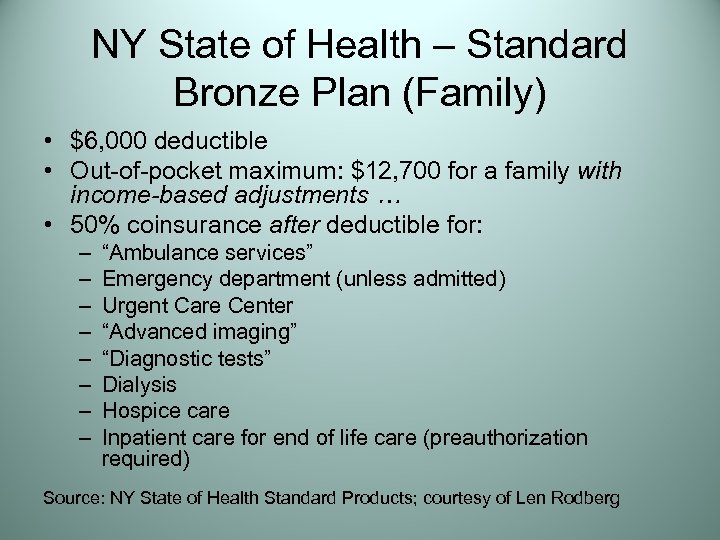 NY State of Health – Standard Bronze Plan (Family) • $6, 000 deductible • Out-of-pocket maximum: $12, 700 for a family with income-based adjustments … • 50% coinsurance after deductible for: – – – – “Ambulance services” Emergency department (unless admitted) Urgent Care Center “Advanced imaging” “Diagnostic tests” Dialysis Hospice care Inpatient care for end of life care (preauthorization required) Source: NY State of Health Standard Products; courtesy of Len Rodberg