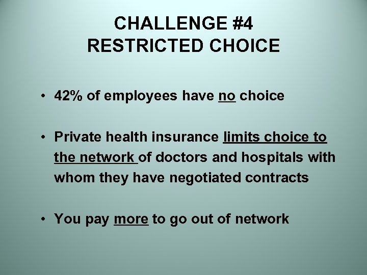 CHALLENGE #4 RESTRICTED CHOICE • 42% of employees have no choice • Private health insurance limits choice to the network of doctors and hospitals with whom they have negotiated contracts • You pay more to go out of network