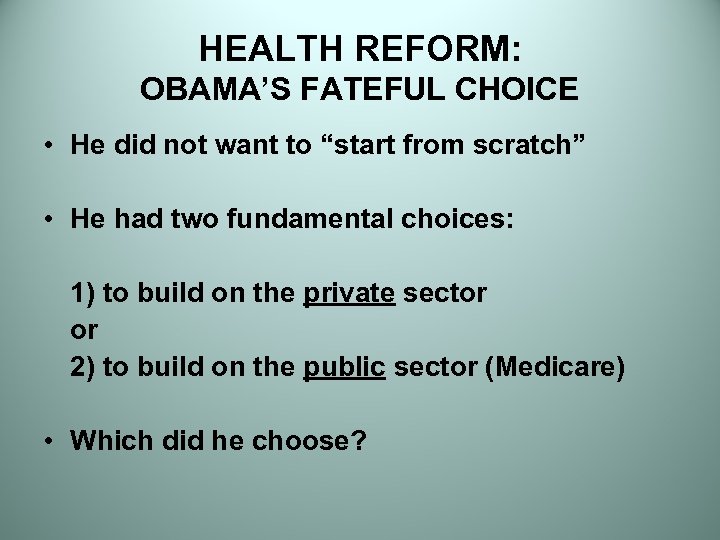 HEALTH REFORM: OBAMA’S FATEFUL CHOICE • He did not want to “start from scratch” • He had two fundamental choices: 1) to build on the private sector or 2) to build on the public sector (Medicare) • Which did he choose?