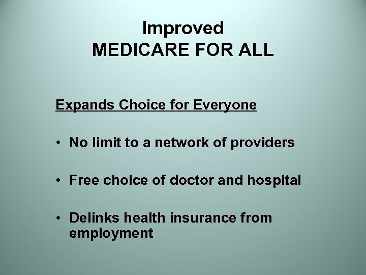 Improved MEDICARE FOR ALL Expands Choice for Everyone • No limit to a network of providers • Free choice of doctor and hospital • Delinks health insurance from employment