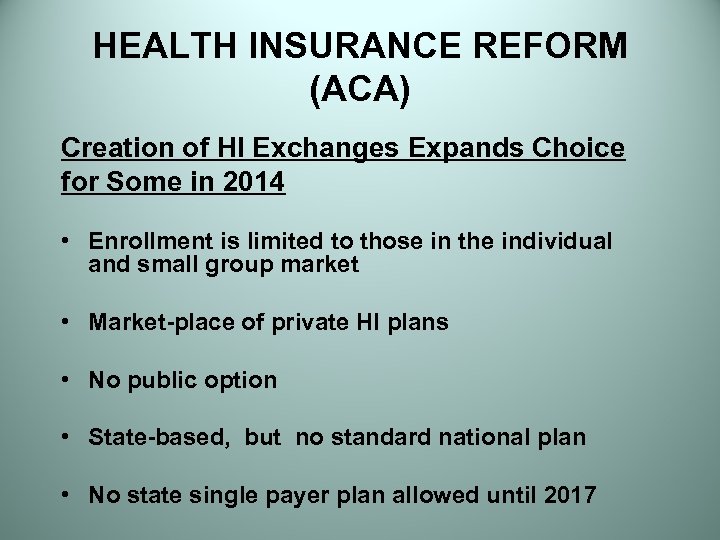 HEALTH INSURANCE REFORM (ACA) Creation of HI Exchanges Expands Choice for Some in 2014 • Enrollment is limited to those in the individual and small group market • Market-place of private HI plans • No public option • State-based, but no standard national plan • No state single payer plan allowed until 2017