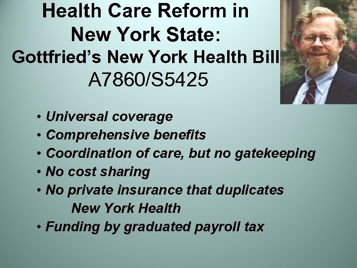 Health Care Reform in New York State: Gottfried’s New York Health Bill A 7860/S 5425 • Universal coverage • Comprehensive benefits • Coordination of care, but no gatekeeping • No cost sharing • No private insurance that duplicates New York Health • Funding by graduated payroll tax