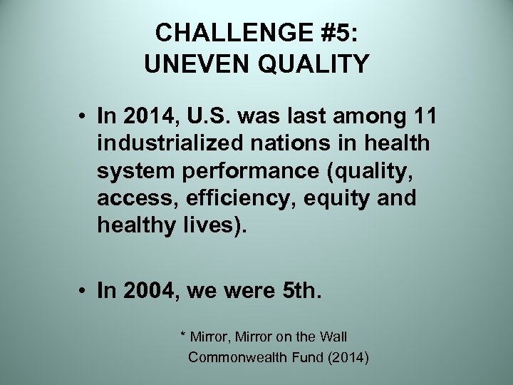 CHALLENGE #5: UNEVEN QUALITY • In 2014, U. S. was last among 11 industrialized nations in health system performance (quality, access, efficiency, equity and healthy lives). • In 2004, we were 5 th. * Mirror, Mirror on the Wall Commonwealth Fund (2014)