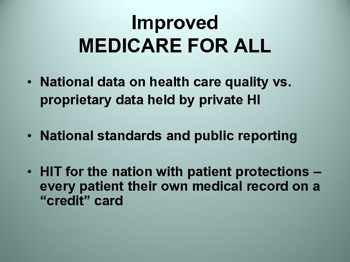 Improved MEDICARE FOR ALL • National data on health care quality vs. proprietary data held by private HI • National standards and public reporting • HIT for the nation with patient protections – every patient their own medical record on a “credit” card