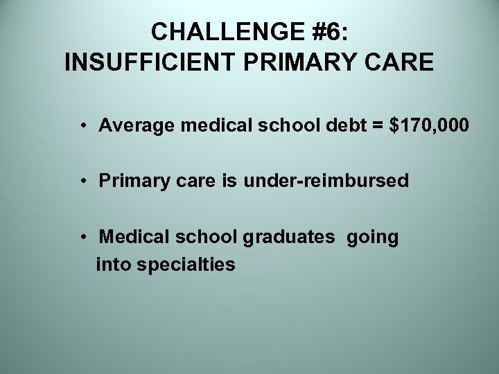 CHALLENGE #6: INSUFFICIENT PRIMARY CARE • Average medical school debt = $170, 000 • Primary care is under-reimbursed • Medical school graduates going into specialties