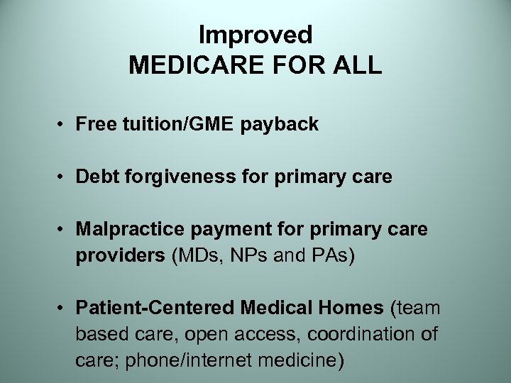 Improved MEDICARE FOR ALL • Free tuition/GME payback • Debt forgiveness for primary care • Malpractice payment for primary care providers (MDs, NPs and PAs) • Patient-Centered Medical Homes (team based care, open access, coordination of care; phone/internet medicine)