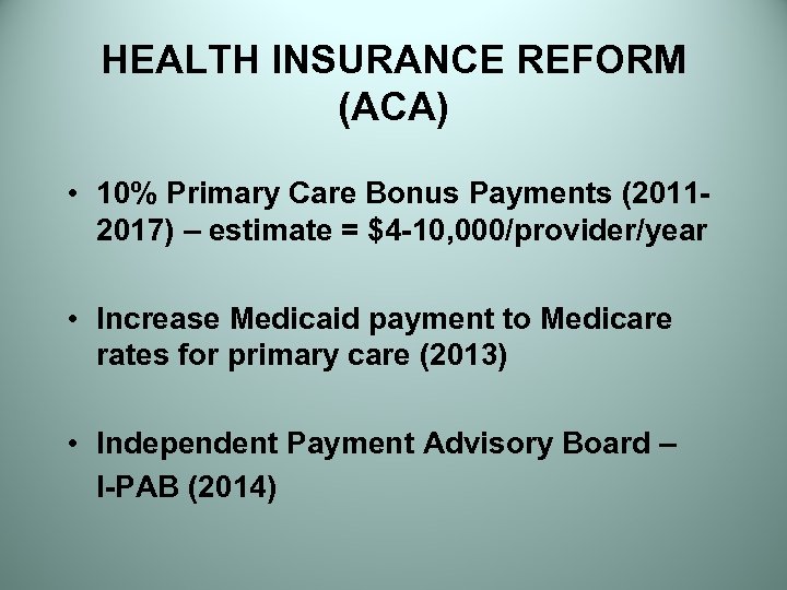 HEALTH INSURANCE REFORM (ACA) • 10% Primary Care Bonus Payments (20112017) – estimate = $4 -10, 000/provider/year • Increase Medicaid payment to Medicare rates for primary care (2013) • Independent Payment Advisory Board – I-PAB (2014)
