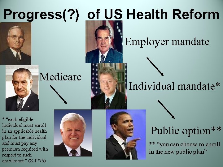 Progress(? ) of US Health Reform Employer mandate Medicare * “each eligible individual must enroll in an applicable health plan for the individual and must pay any premium required with respect to such enrollment. ” (S. 1775) Individual mandate* ? ? Public option** ** “you can choose to enroll in the new public plan”