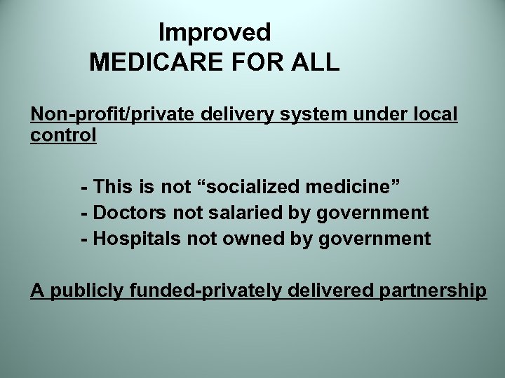 Improved MEDICARE FOR ALL Non-profit/private delivery system under local control - This is not “socialized medicine” - Doctors not salaried by government - Hospitals not owned by government A publicly funded-privately delivered partnership