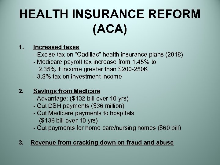 HEALTH INSURANCE REFORM (ACA) 1. Increased taxes - Excise tax on “Cadillac” health insurance plans (2018) - Medicare payroll tax increase from 1. 45% to 2. 35% if income greater than $200 -250 K - 3. 8% tax on investment income 2. Savings from Medicare - Advantage: ($132 bill over 10 yrs) - Cut DSH payments ($36 million) - Cut Medicare payments to hospitals ($136 bill over 10 yrs) - Cut payments for home care/nursing homes ($60 bill) 3. Revenue from cracking down on fraud and abuse