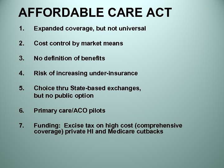 AFFORDABLE CARE ACT 1. Expanded coverage, but not universal 2. Cost control by market means 3. No definition of benefits 4. Risk of increasing under-insurance 5. Choice thru State-based exchanges, but no public option 6. Primary care/ACO pilots 7. Funding: Excise tax on high cost (comprehensive coverage) private HI and Medicare cutbacks