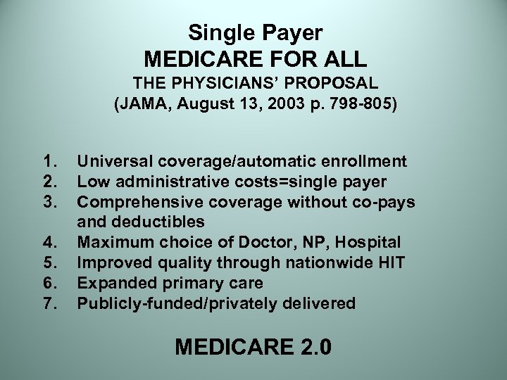 Single Payer MEDICARE FOR ALL THE PHYSICIANS’ PROPOSAL (JAMA, August 13, 2003 p. 798 -805) 1. 2. 3. 4. 5. 6. 7. Universal coverage/automatic enrollment Low administrative costs=single payer Comprehensive coverage without co-pays and deductibles Maximum choice of Doctor, NP, Hospital Improved quality through nationwide HIT Expanded primary care Publicly-funded/privately delivered MEDICARE 2. 0