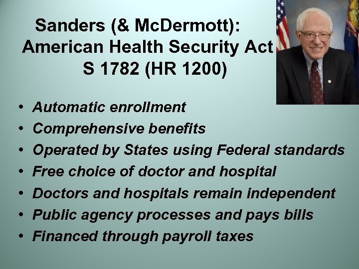 Sanders (& Mc. Dermott): American Health Security Act S 1782 (HR 1200) • • Automatic enrollment Comprehensive benefits Operated by States using Federal standards Free choice of doctor and hospital Doctors and hospitals remain independent Public agency processes and pays bills Financed through payroll taxes