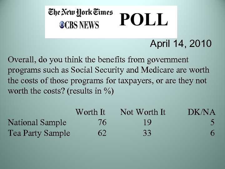 April 14, 2010 Overall, do you think the benefits from government programs such as Social Security and Medicare worth the costs of those programs for taxpayers, or are they not worth the costs? (results in %) Worth It National Sample 76 Tea Party Sample 62 Not Worth It 19 33 DK/NA 5 6