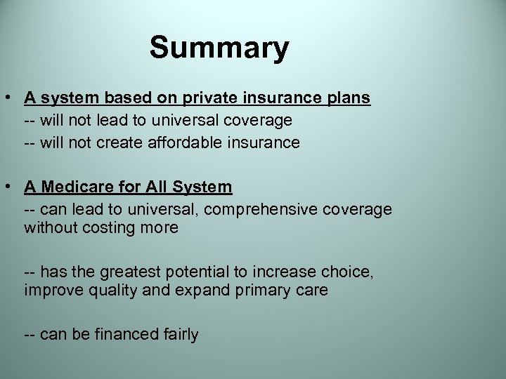 Summary • A system based on private insurance plans -- will not lead to universal coverage -- will not create affordable insurance • A Medicare for All System -- can lead to universal, comprehensive coverage without costing more -- has the greatest potential to increase choice, improve quality and expand primary care -- can be financed fairly