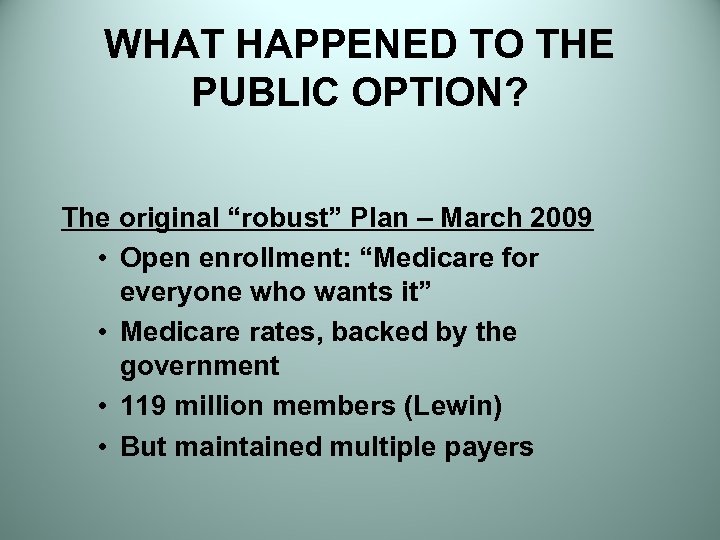 WHAT HAPPENED TO THE PUBLIC OPTION? The original “robust” Plan – March 2009 • Open enrollment: “Medicare for everyone who wants it” • Medicare rates, backed by the government • 119 million members (Lewin) • But maintained multiple payers