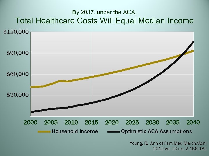 By 2037, under the ACA, Total Healthcare Costs Will Equal Median Income $120, 000 $90, 000 $60, 000 $30, 000 2005 2010 2015 Household Income 2020 2025 2030 2035 2040 Optimistic ACA Assumptions Young, R. Ann of Fam Med March/April 2012 vol 10 no. 2 156 -162