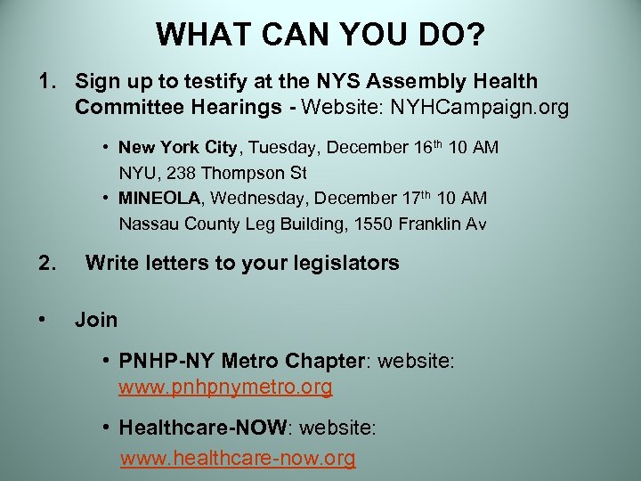 WHAT CAN YOU DO? 1. Sign up to testify at the NYS Assembly Health Committee Hearings - Website: NYHCampaign. org • New York City, Tuesday, December 16 th 10 AM NYU, 238 Thompson St • MINEOLA, Wednesday, December 17 th 10 AM Nassau County Leg Building, 1550 Franklin Av 2. Write letters to your legislators • Join • PNHP-NY Metro Chapter: website: www. pnhpnymetro. org • Healthcare-NOW: website: www. healthcare-now. org