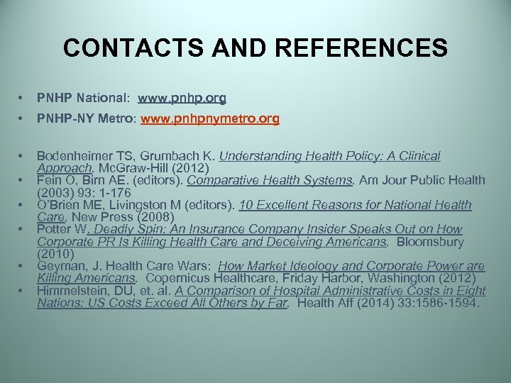 CONTACTS AND REFERENCES • PNHP National: www. pnhp. org • PNHP-NY Metro: www. pnhpnymetro. org • Bodenheimer TS, Grumbach K. Understanding Health Policy: A Clinical Approach. Mc. Graw-Hill (2012) Fein O, Birn AE. (editors). Comparative Health Systems. Am Jour Public Health (2003) 93: 1 -176 O’Brien ME, Livingston M (editors). 10 Excellent Reasons for National Health Care. New Press (2008) Potter W. Deadly Spin: An Insurance Company Insider Speaks Out on How Corporate PR Is Killing Health Care and Deceiving Americans. Bloomsbury (2010) Geyman, J. Health Care Wars: How Market Ideology and Corporate Power are Killing Americans. Copernicus Healthcare, Friday Harbor, Washington (2012) Himmelstein, DU, et. al. A Comparison of Hospital Administrative Costs in Eight Nations: US Costs Exceed All Others by Far. Health Aff (2014) 33: 1586 -1594. • • •
