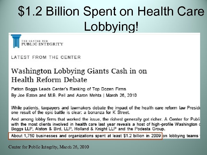 $1. 2 Billion Spent on Health Care Lobbying! Center for Public Integrity, March 26, 2010