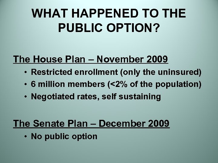 WHAT HAPPENED TO THE PUBLIC OPTION? The House Plan – November 2009 • Restricted enrollment (only the uninsured) • 6 million members (<2% of the population) • Negotiated rates, self sustaining The Senate Plan – December 2009 • No public option